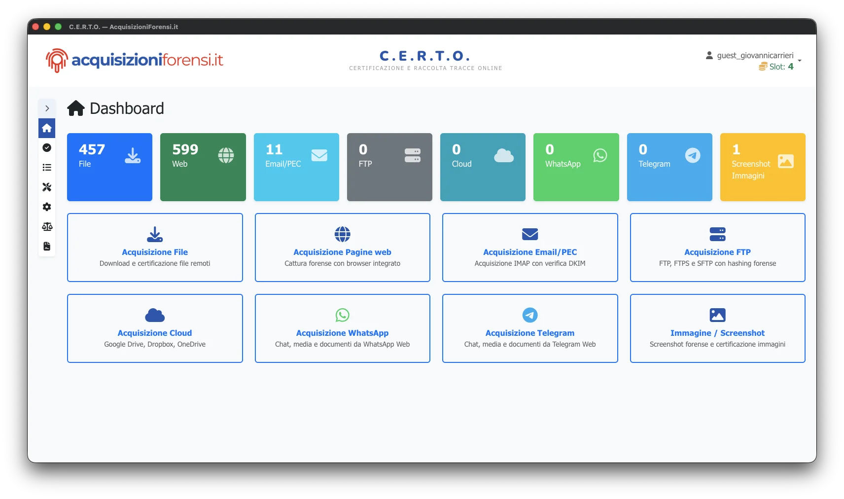 Applicazione desktop con browser integrato per indagini forensi approfondite. Tutti gli 8 moduli di acquisizione: pagine web, file, email, immagini, FTP/SFTP, Cloud, WhatsApp e Telegram. Video recording HD, marca temporale qualificata eIDAS, report forense certificato.