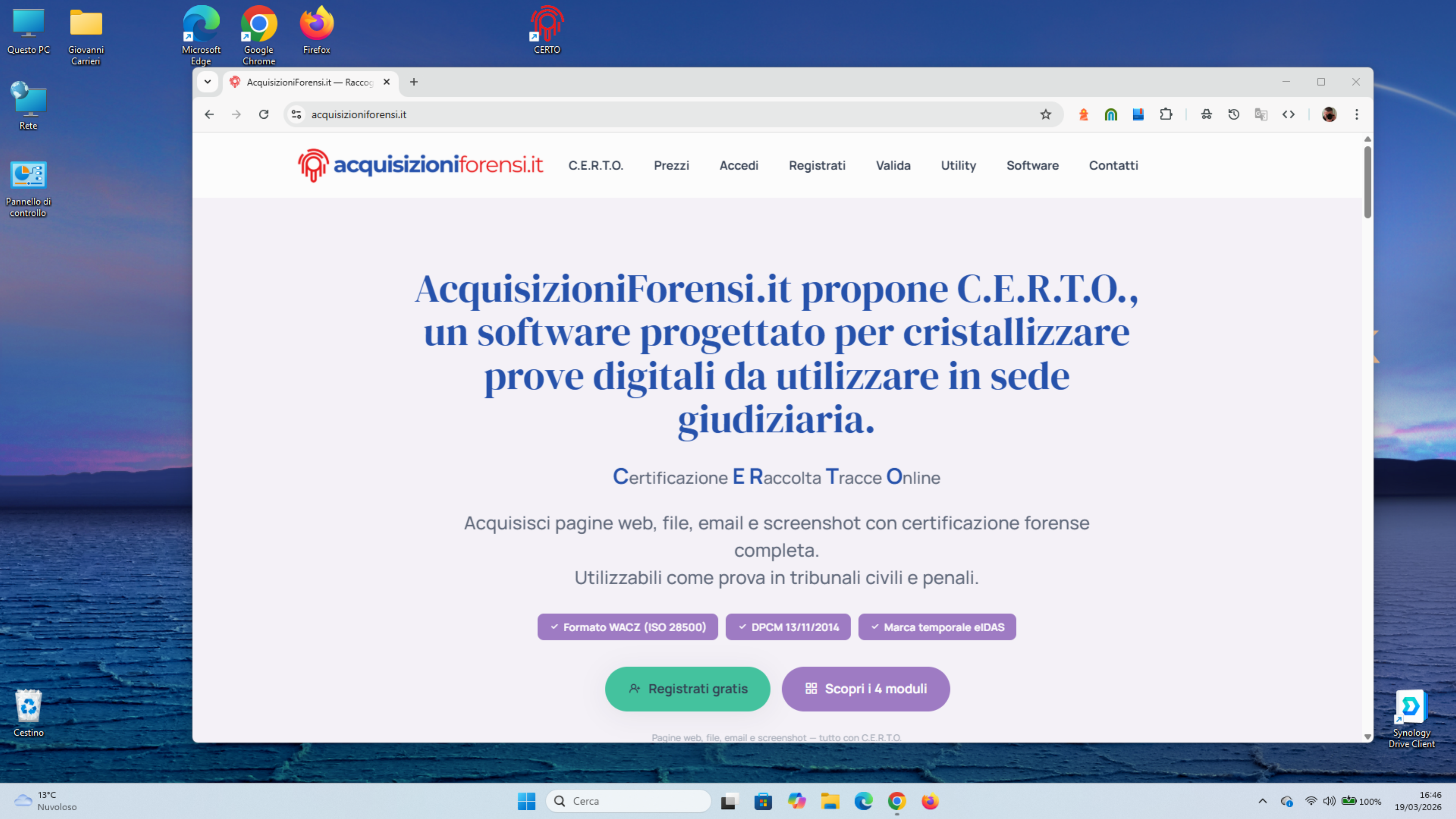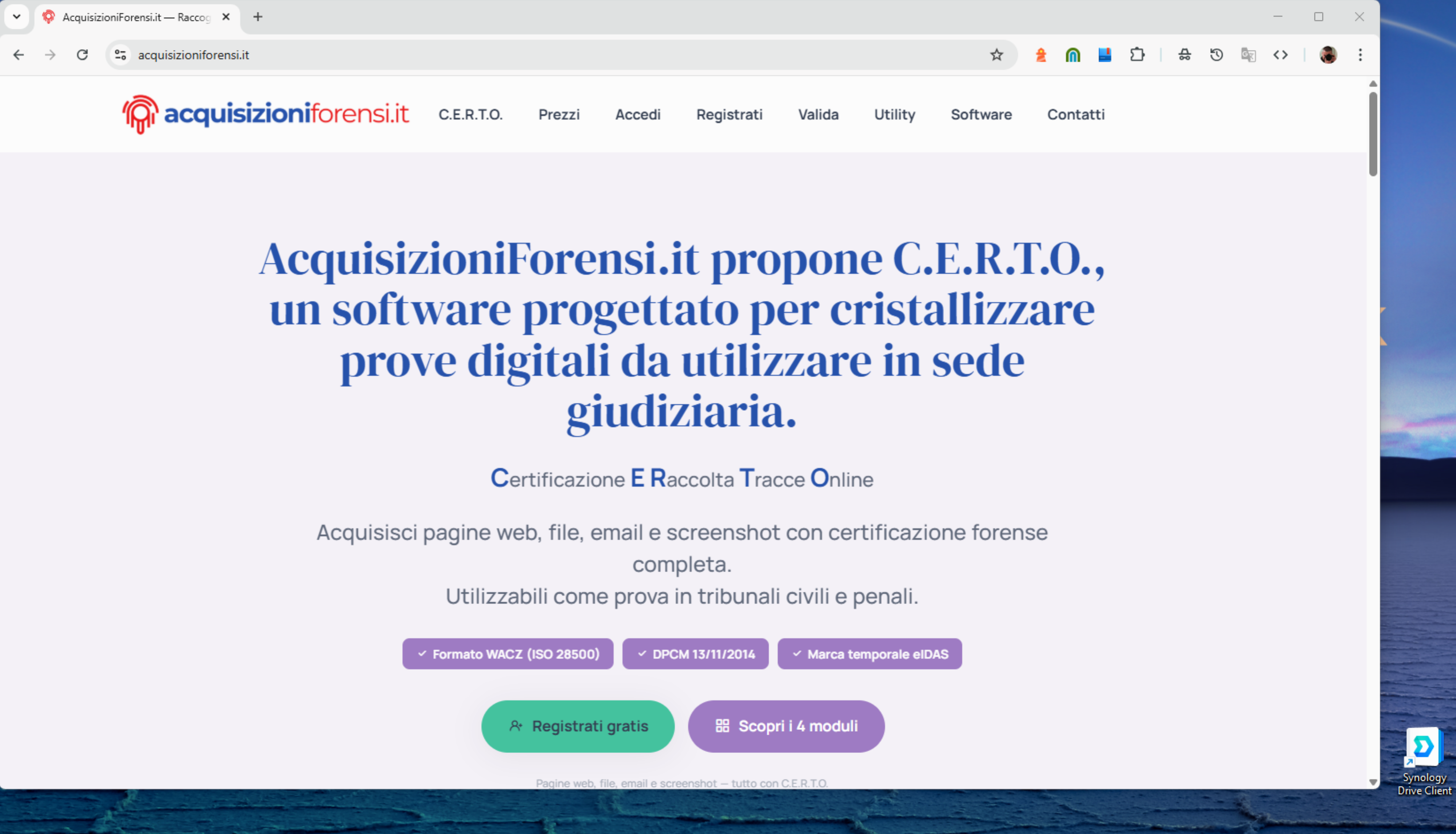 Acquisisci screenshot, pagine web, file e email con valore legale. Cattura atomica, marca temporale e verifica online.